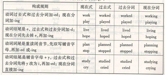 大多数动词都有四种基本形式:(1)现在式;(2)过去式;(3)现在分词;(4)过去分词。按照动词各种形式的构成方法,动词可分成规则动词和不规则动词两类。